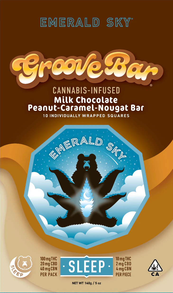 Emerald Sky Groove Bars Sleep CBN combines California's premier chocolate craftsmanship with targeted sleep support for the ultimate nighttime indulgence. This exceptional treat features roasted peanuts, creamy caramel, rich nougat, and silky chocolate, all expertly infused with premium CBN cannabis extract designed to promote restful sleep and relaxation.