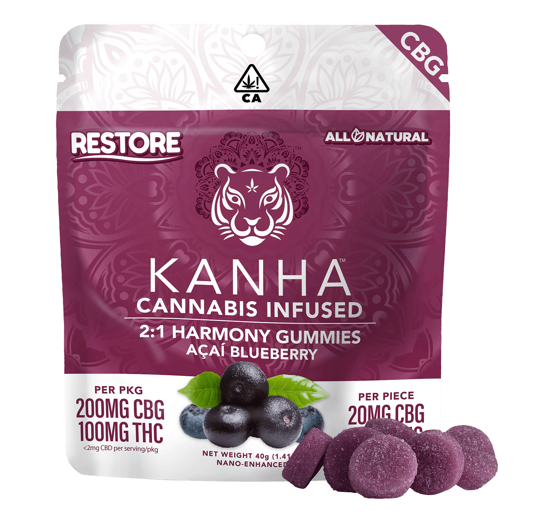 Made with real blueberry and açaí flavors, Harmony Restore delivers 20mg of CBG and 10mg of THC in each tropical gummy, boosted by our exclusive NANO technology for better absorption and faster onset times. CBG, the “mother cannabinoid” and stem cell equivalent in cannabis, is a rare compound that serves as the botanical source for THC, CBD and other cannabinoids. As one of the leading CBG products anywhere, Harmony Restore refreshes the body and soul with generous cannabinoid content and hybrid terpenes like α-humulene, β-caryophyllene and myrcene.