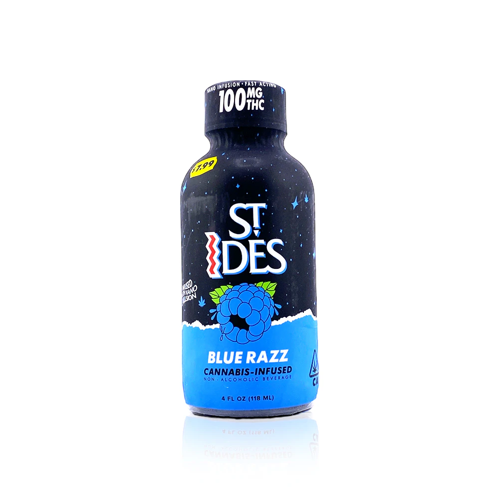Indulge in the potent sensation of ST IDES - Drink - Blue Razz, a compact 4oz shot delivering a robust 100MG of THC. This vibrant blue raspberry flavored beverage may be small in size, but it packs a significant punch, offering consumers an intense, flavorful cannabis experience. Unlike traditional edibles, ST IDES Cannabis Infused shots are formulated for quicker absorption into your system, delivering effects more rapidly and efficiently. The sweet, tangy blue raspberry taste masks the cannabis flavor perfectly, making it an enjoyable way to consume your preferred dose of THC.
